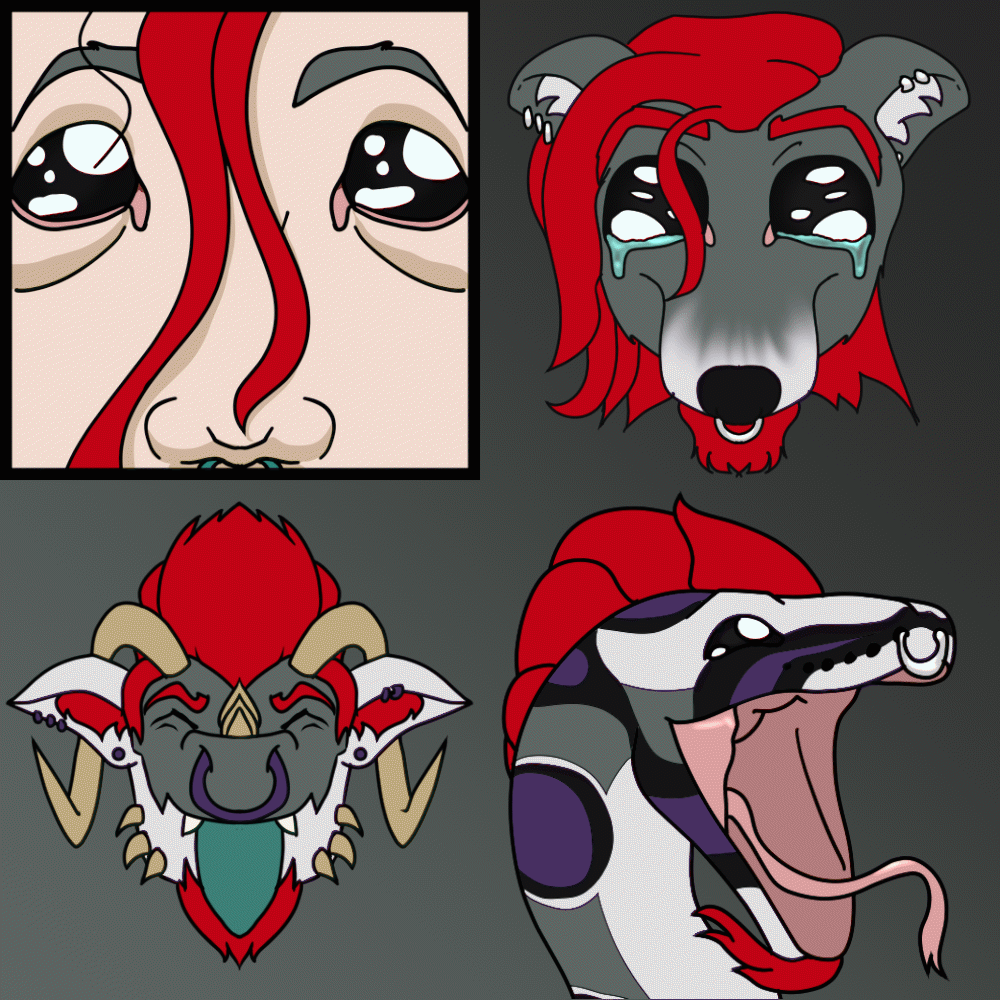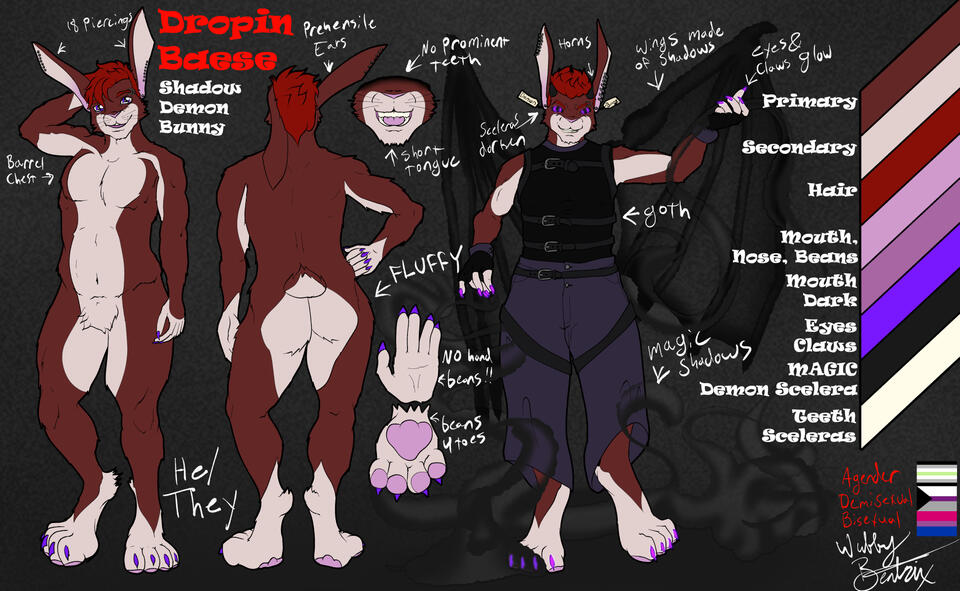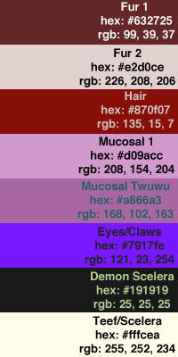$100 reference sheet is highly personal, and I may charge extra for additional features. Basics included is a front and back view, a custom shape color pallet, vector/png formats of difficult markings/tattoos, and my convenience pallet (Example to left). Additional features may include, but are not limited to: outfit, zoom in, emotes, tattoos, piercing specificities, etc. Price may also go up with complexity, but I will discuss that with you, and I will work with you on budget vs. end result. MORE EXAMPLES